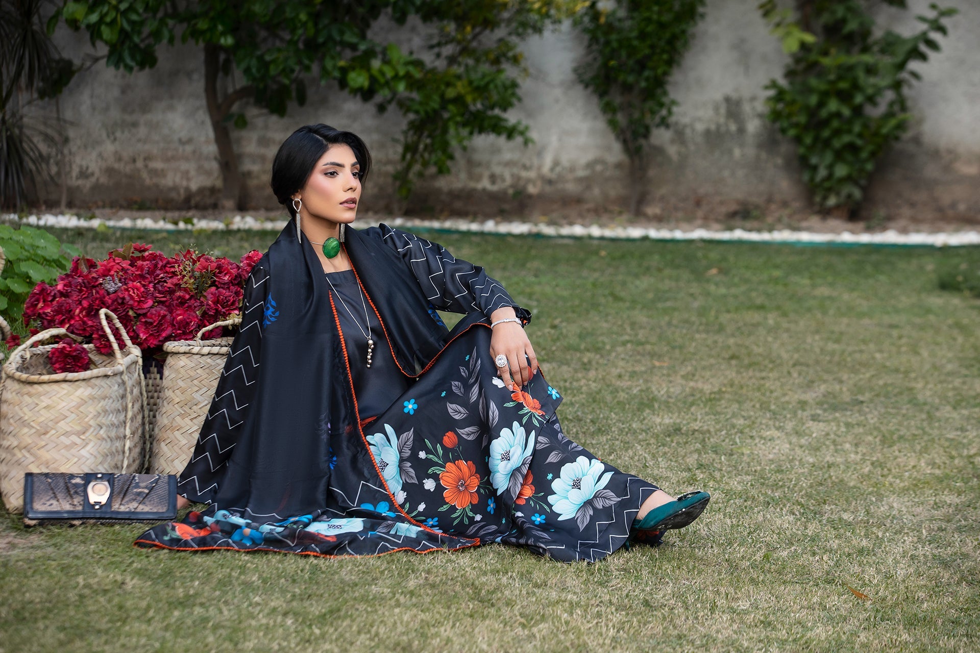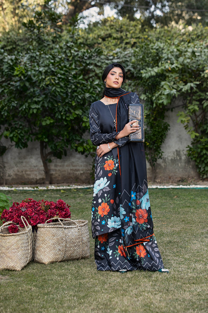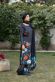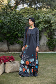 A chic black Silk printed dress featuring a drop-corner long shirt with loop-sleeve buttons, paired with culotte trousers and a matching printed silk dupatta; adorned with bright and nude floral motifs and wavy line designs on the shirt and dupatta pallus — an artistic and elegant printed ensemble.