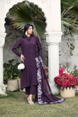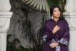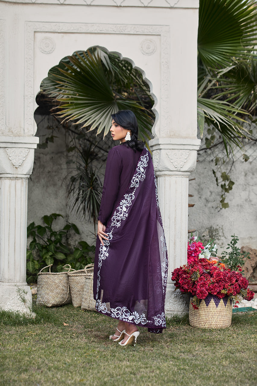 A button-down mauve raw silk ensemble with straight pants, paired with a hand-painted organza dupatta featuring clean geometric borders — a chic, modern casual look with effortless elegance.