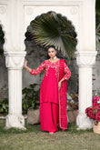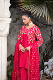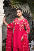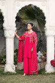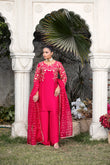 A vibrant hot-pink ensemble featuring a delicately stitched floral-jaal embroidery, paired with box-cut trousers and an organza jacquard bindi dupatta—a perfect blend of bold elegance for both casual and semi-formal moments.