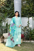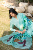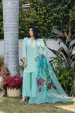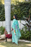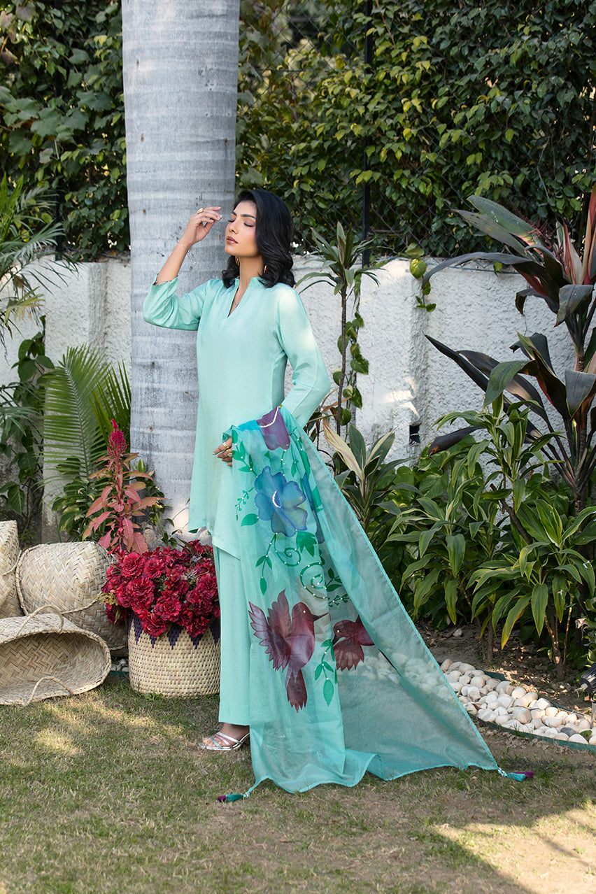 A sea-green raw silk outfit with subtle embellishment, paired with a sourwood organza dupatta hand-painted in full floral artwork and delicate hummingbirds, finished with playful tassels — a serene and artistic casual wear piece.